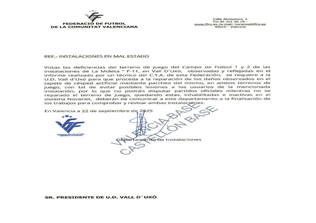 Segons indica en el seu escrit la Federació, “es requereix a la UD Vall de Uxó perquè procedeixi a la reparació dels danys observats a la catifa de gespa artificial” amb l'objectiu d'evitar possibles lesions als usuaris de les instal·lacions esportives.